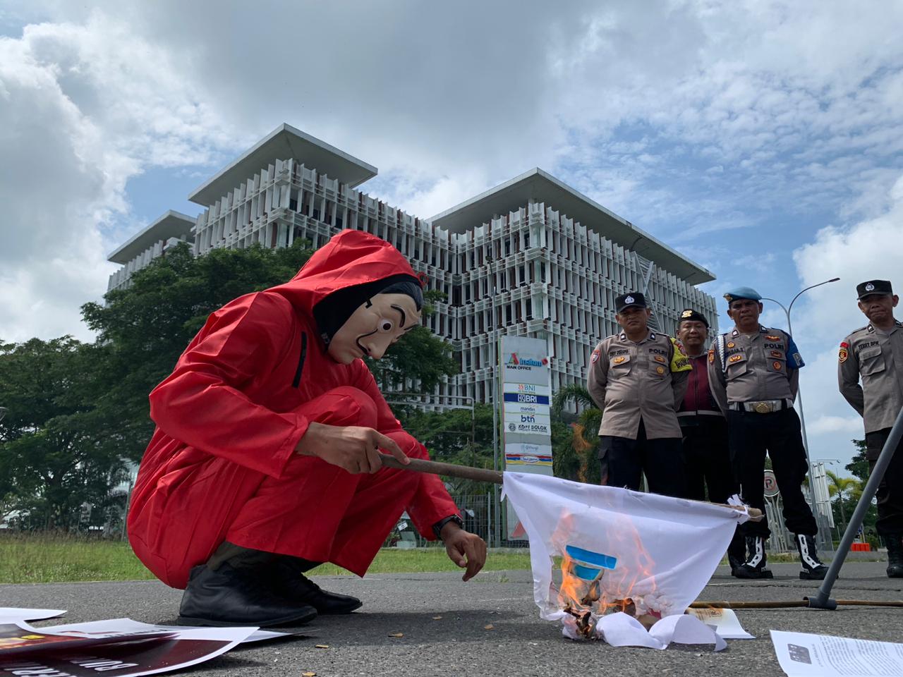 Aksi Aktivis Bertopeng Bakar Bendera di Gedung Inalum