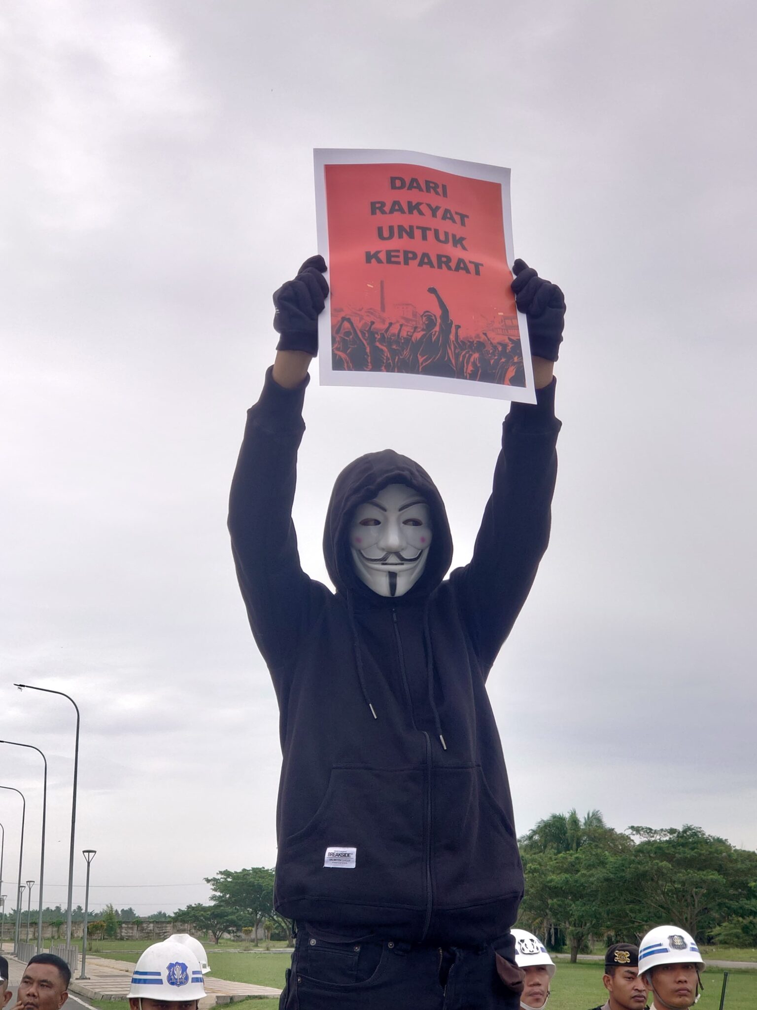 “Hari ini kami melakukan aksi demonstrasi di depan gedung PT Inalum. Kami meminta agar PT Inalum membayarkan pesangon para buruh yang sebelumnya sudah di PHK dan sampai saat ini belum ada menerima hak mereka,” ungkap Mr. K dari balik topengnya.