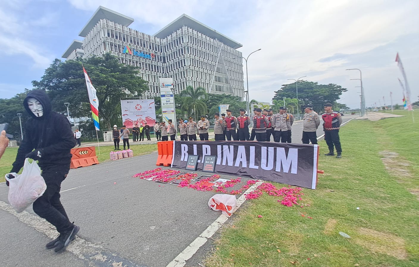 Halak.id > Blog > Hukum dan Peristiwa > Aksi Pria Bertopeng Guy Fawkes Tabur Bunga di Inalum: Matinya Nurani